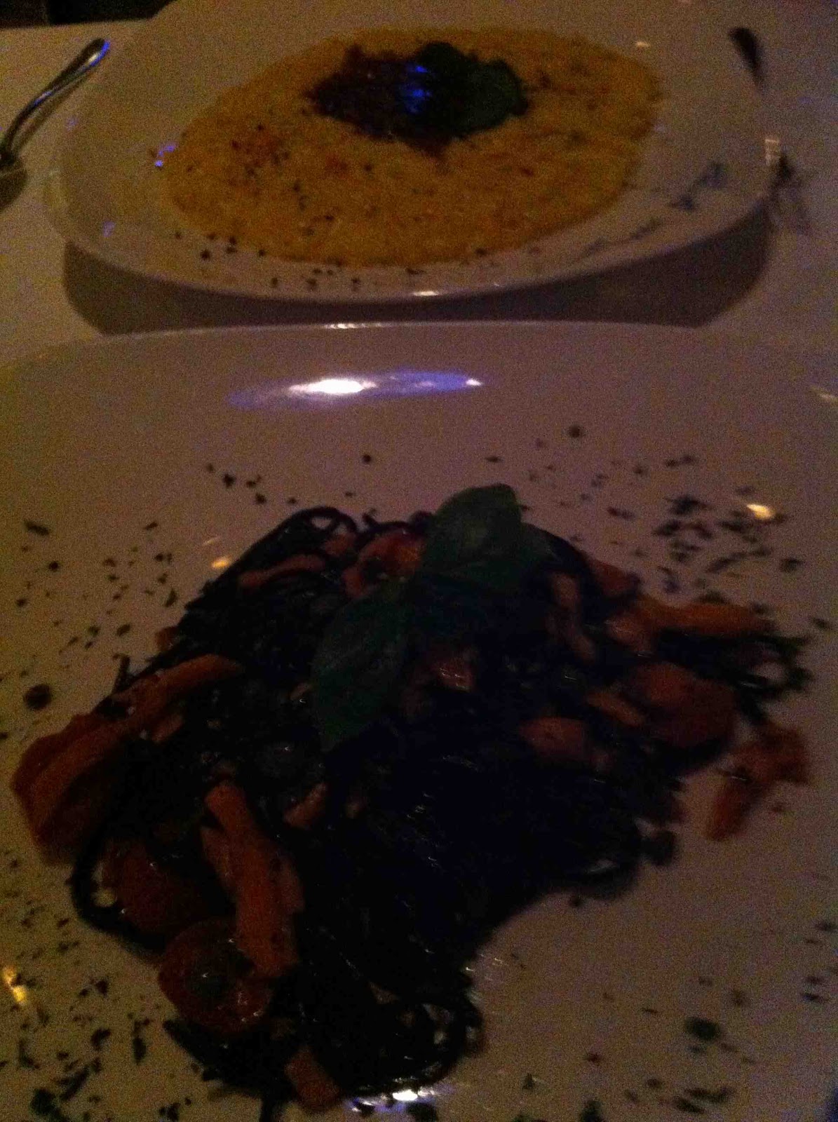 my squid ink pasta with smoked salmon was alright except the salmon was bloooooody saltish i gave half to hao.